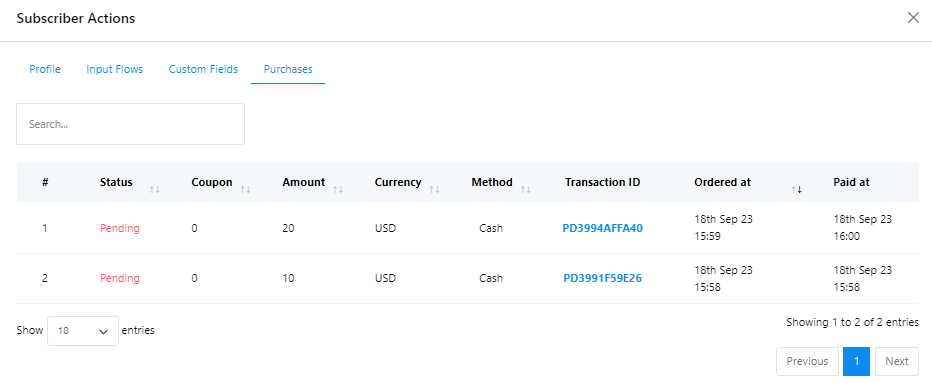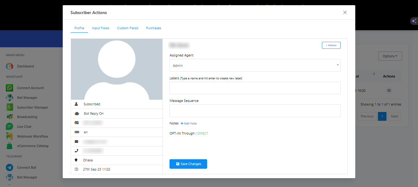 - Click on Action to unsubscribe a subscriber, pause or resume the bot reply, reset user input flow, or sync subscriber data.